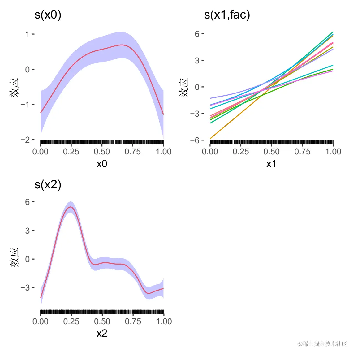 和因子光滑函数交互项,相当于光滑曲线的随机斜率和截距,被画在一个面板上,颜色被用来区分不同的随机光滑函数。