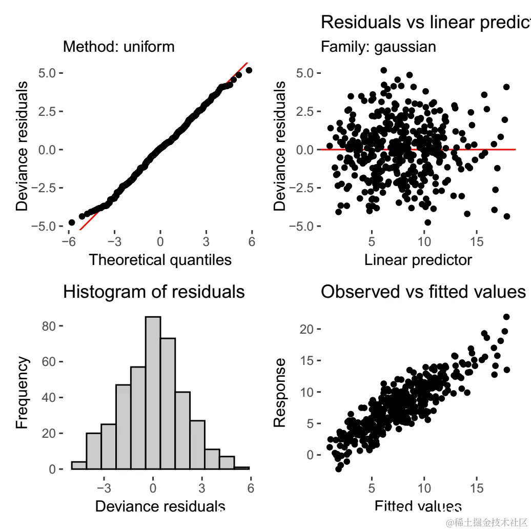 check()函数,用于检查模型中的每个光滑函数是否使用了足够数量的基函数。你可能没有直接使用check()——会输出其他诊断结果,也会产生四个模型诊断图。