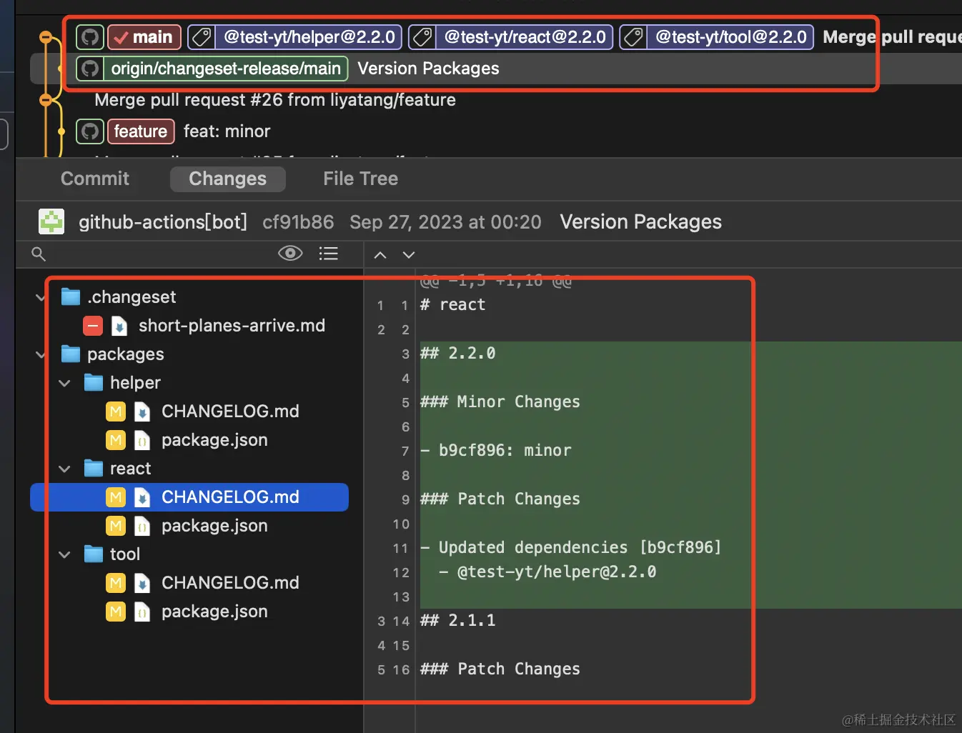 npx changeset,选择包和版本和记录 changelog。会在.changeset下生成 md 文件。可多个。 - git commit 提交变更