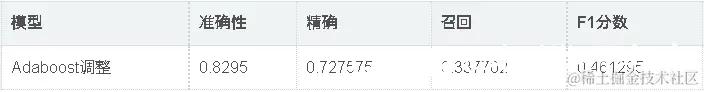 因此,我们已经看到,调整后的Adaboost的准确性约为82.95%,并且在所有其他性能指标(例如F1分数,Precision,ROC和Recall)中也取得了不错的成绩。