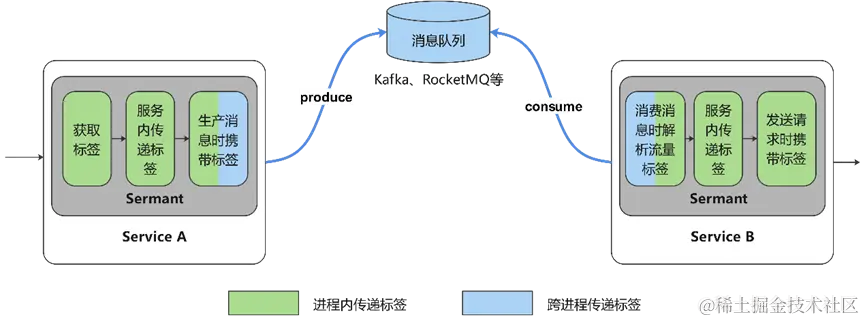 消息队列的标签透传与之类似,不同之处在于流量标记会在生产时发送到中间件的服务端,消费时从服务端拉取消息并解析出流量标签。