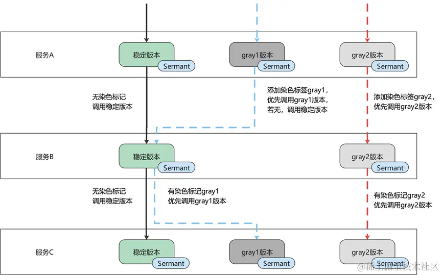 (1)标签路由插件配置流量的染色规则,比如灰度流量添加x-sermant-version:gray1,x-sermant-version:gray2标签。(该步骤可选,可用API网关等其他方式染色)