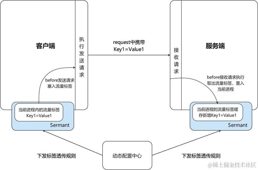 在Sermant流量标签透传插件中,对于客户端,我们利用字节码增强在http、rpc发送请求以及消息队列生产消息处构造切面,并在切面处获取当前进程内的流量标签,在发送请求时或生产消息时将流量标签注入header、attachment等。对于服务端,在http、rpc接收请求以及消息队列消费消息的切面处,将header、attachment等里面的流量标签取出,在服务端进程内继续透传。一次http或rpc的跨进程标签传递过程如下图所示: