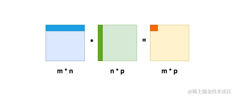 那么现在结果矩阵中,一共有m*p个橘色方块,则意味着我们需要进行:m*p*(n + n - 1)次浮点计算。