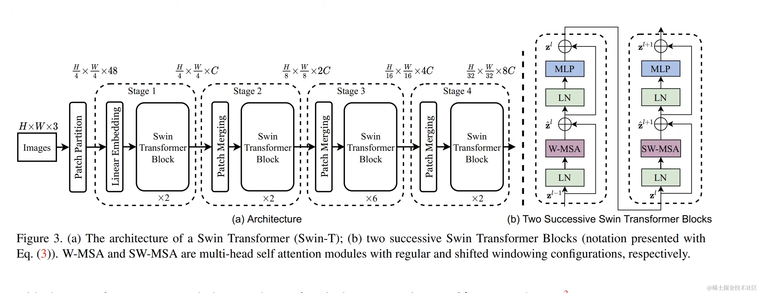 我们再来看图(b),它表示Swin Transformer的架构,具有以下特点: