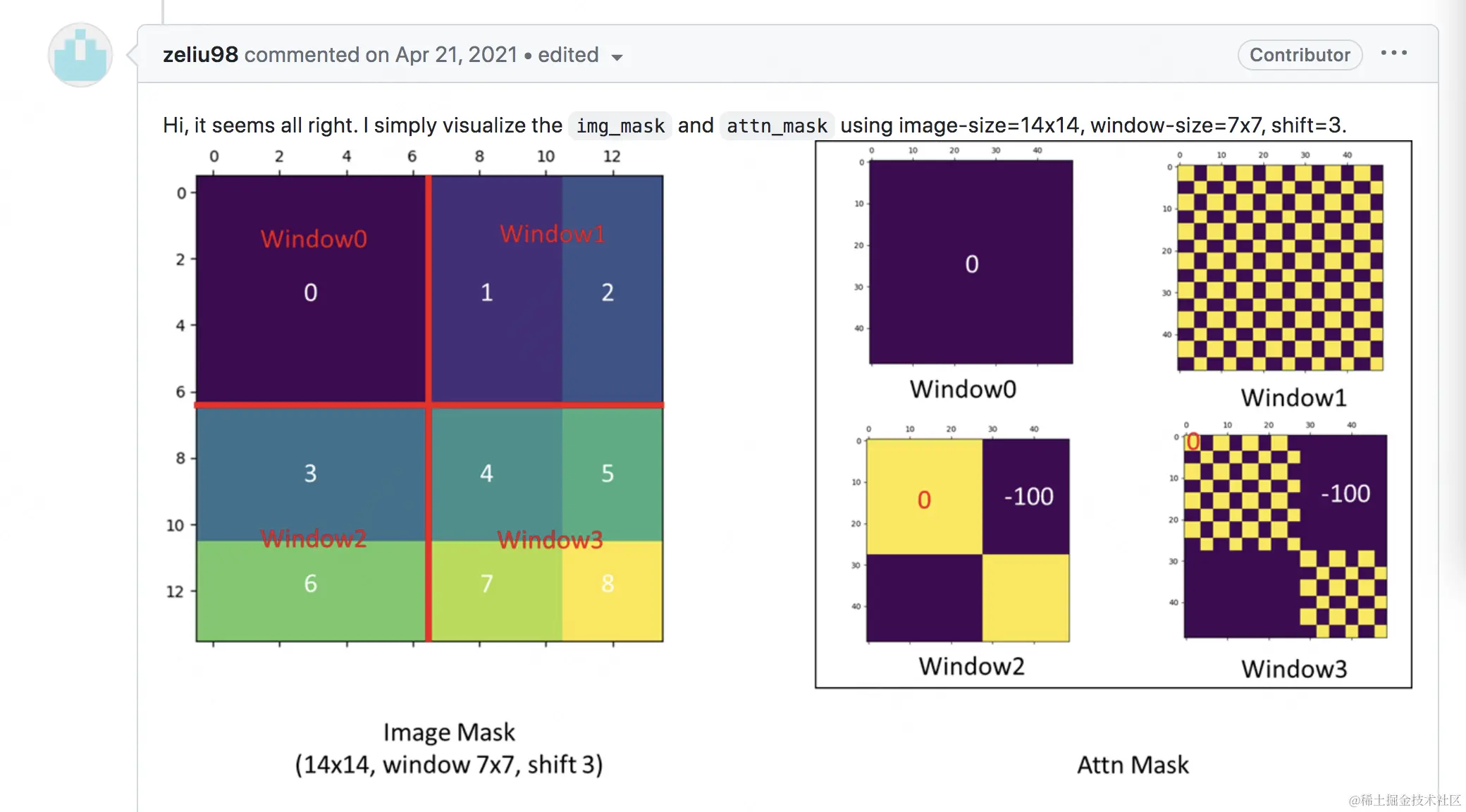 以上图例来自Swin Transformer github issue,由一作绘制得出,它非常直观地展现出了掩码attention的计算过程。我们可以将其和4.3中做完环状移动窗口后的图对比来看。