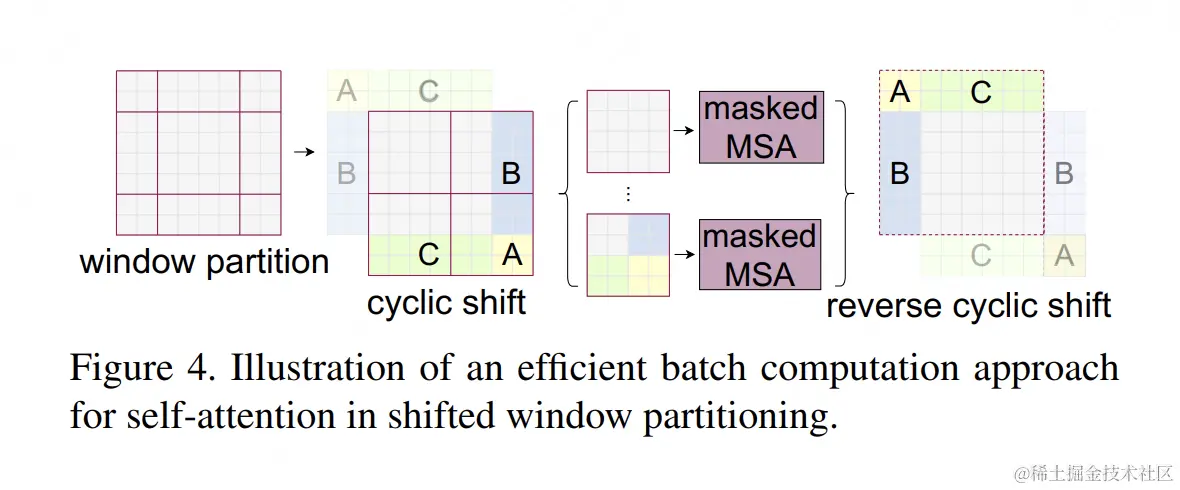 这个“环状”听起来玄学,其实理解起来不复杂。如上图,最开始是9个不均匀的patch。接着,为了让它均匀,我们将原来的A、B、C部分做一个旋转拼接,就又可以恢复成一个有4个window,且patch数量均匀的数据了。