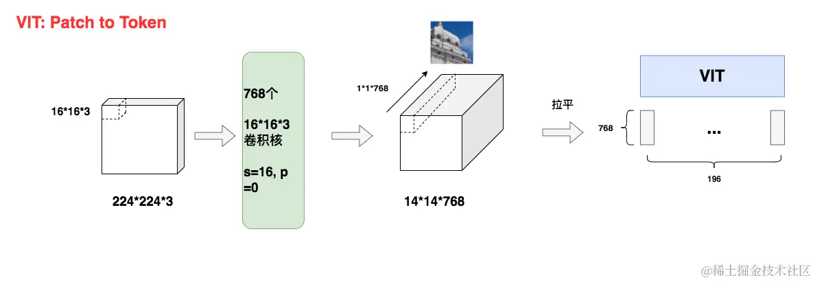 在实际代码操作中,以上两个步骤可以用一个nn.Conv2d完成,我们在VIT原理篇中画过示例,这里我们再展示一次,将图中小patch的尺寸换成4*4*3,将卷积核变成96个4*4*3的卷积核,stride=patch_size=4,padding=0,就能得到一个56*56*96大小的方块了。那么拉平后,类比于NLP任务,我们就可得到56*56=3136个token,每个token的维度为96。
