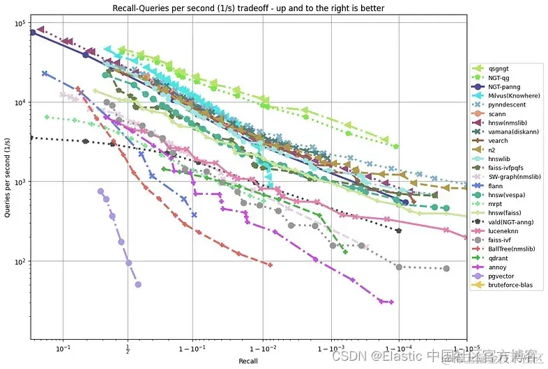 上图中没有体现的是索引的成本以及算法是否可以支持更新和 CRUD 操作。 有些是面向批处理的,因此它们首先需要大量文档向量样本才能构建索引,而另一些则可以增量构建索引。 请注意,ann-benchmark 只能使用开源算法在同一运行时上进行重现。 一些商业和专有向量搜索供应商在召回与性能之间进行了未知的权衡。