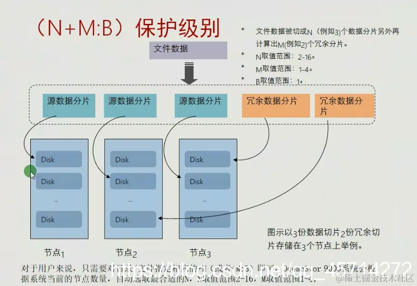 N+M:B 坏M块硬盘或者B=1个节点数据不丢失,业务不中断