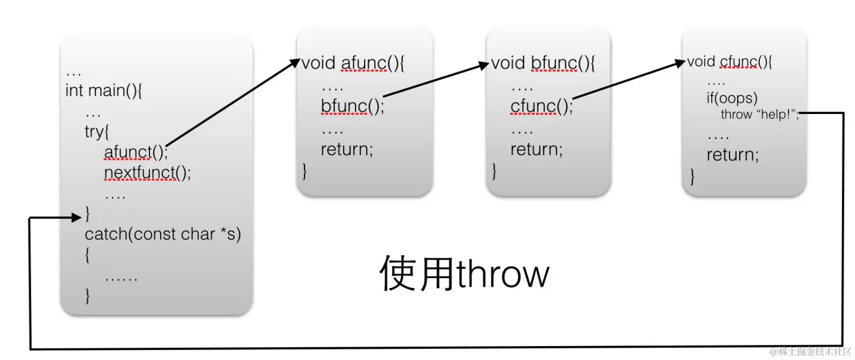 在《C++异常处理》一节中,我们讲到了 C++ 异常处理的流程,具体为: