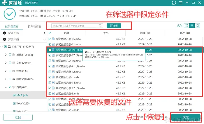 4.深度扫描完成后,可被恢复的数据都会呈现,此时可以再一次对文件进行选择,选择完成后,点击 【恢复】 。