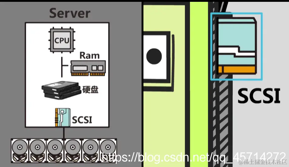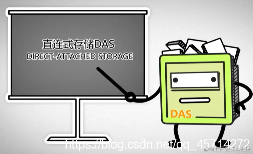 DAS(直连式存储)即外部磁盘阵列,通过scsi卡把多个硬盘串在一起挂在一台服务器之外