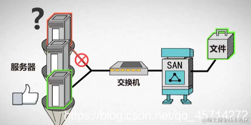 它通过网络连接,实现多台服务器之间的数据共享!