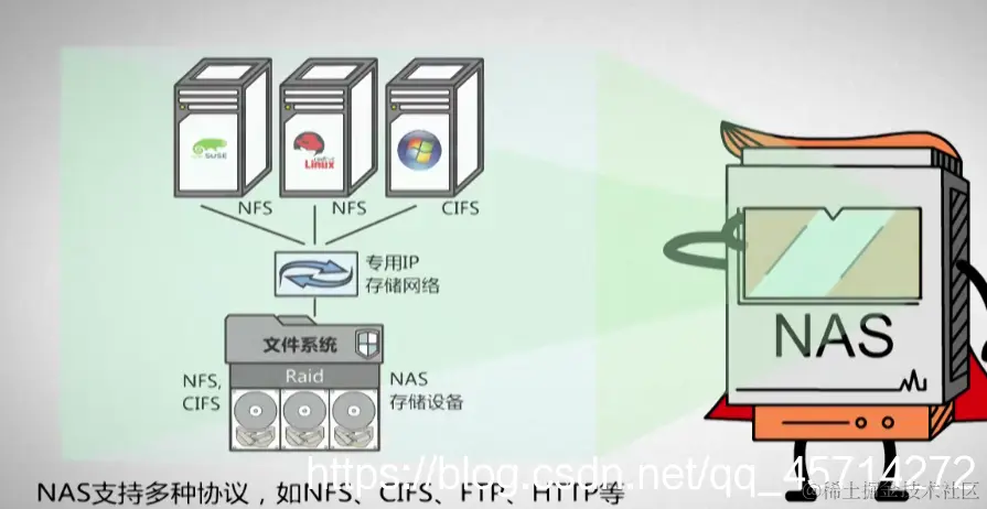 这时我们请出NAS同学,不同的文件系统通过不同的文件系统访问数据