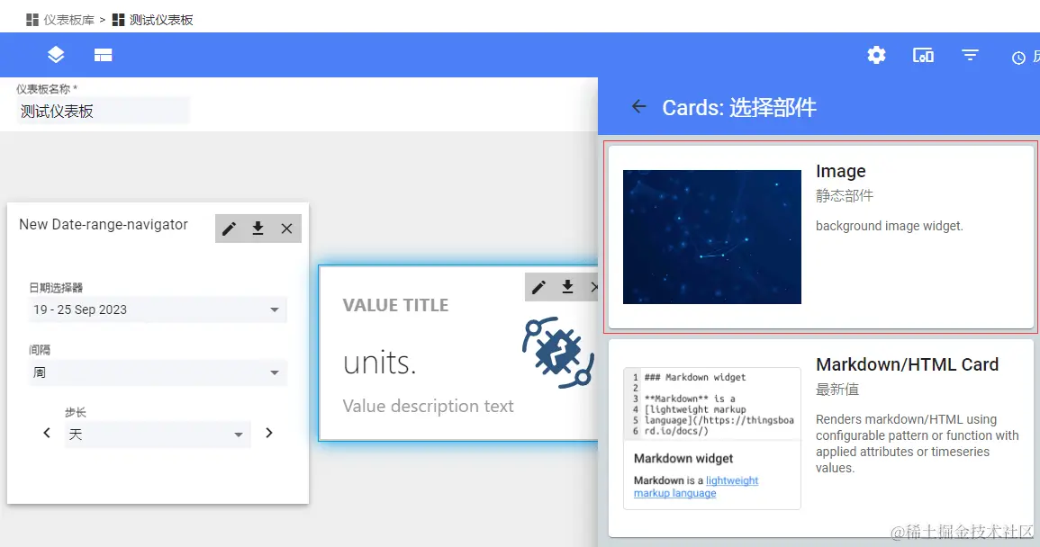 用 FormGroup 表单控件 imageWidgetSettingsForm 存储数据,数据字段 imageUrl 用存储背景图,使用 TB 的 tb-image-input 上传图片组件。另一个数据字段 isUnderLayer 用来存储是否设定为背景图片,即是否可拖拽到其他部件下方,使用 UI 插件 Material 的滑块开关组件 mat-slide-toggle 来实现。