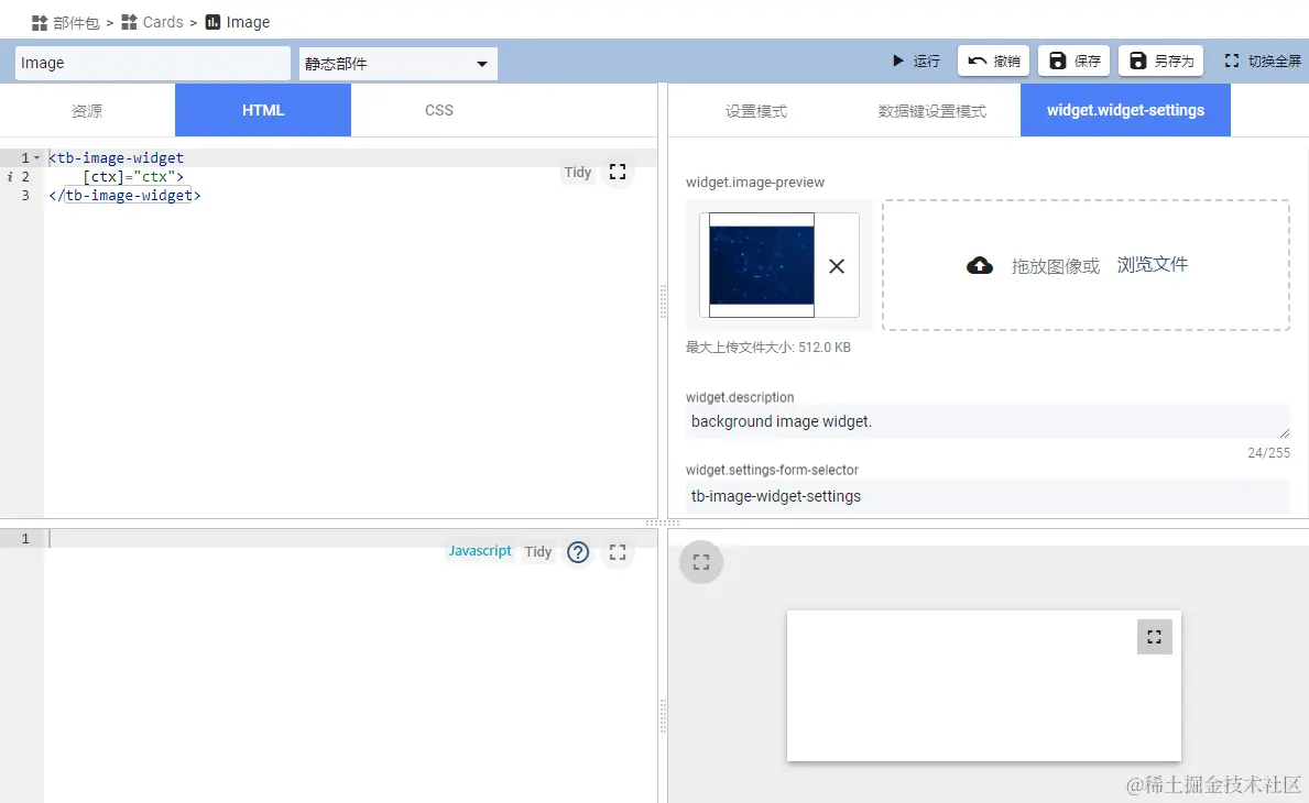 其中第 2 项中 [ctx]="ctx" 为组件传值必须项,不能省略;第 4 项的 tb-image-widget-settings 为部件高级设置选择器,不能填错。