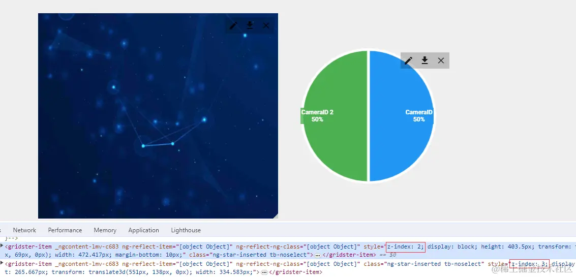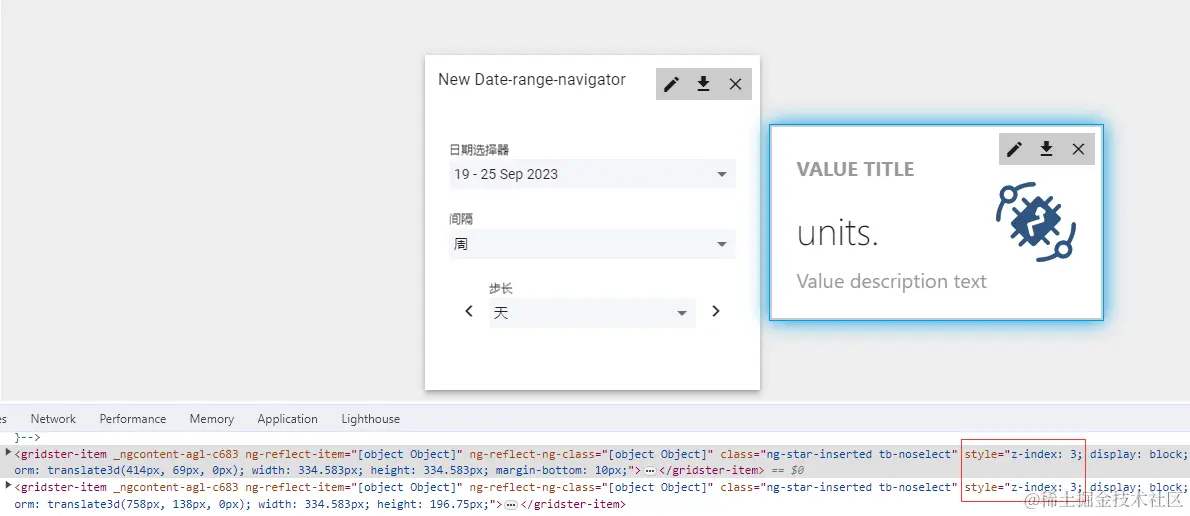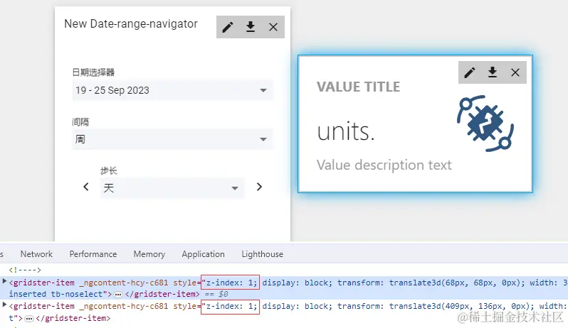 在开发者工具中可以查看到,两个部件元素样式 z-index: 1 一致,均在一个层级上,所以无法重叠。