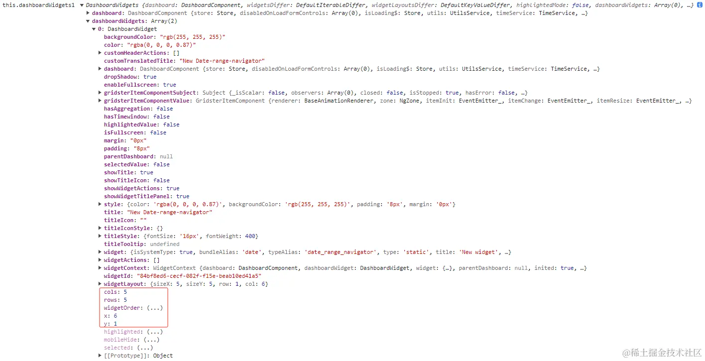 果然找到了栅格单元参数 cols, rows, y, x,我们只需要找到对应的背景图片部件,设置上 layerIndex 属性即可,那怎么找到呢?对了,就是通过高级设置的字段 isUnderLayer,在 dashboard.component.ts 文件中 updateWidgets() 方法体中加入判断。