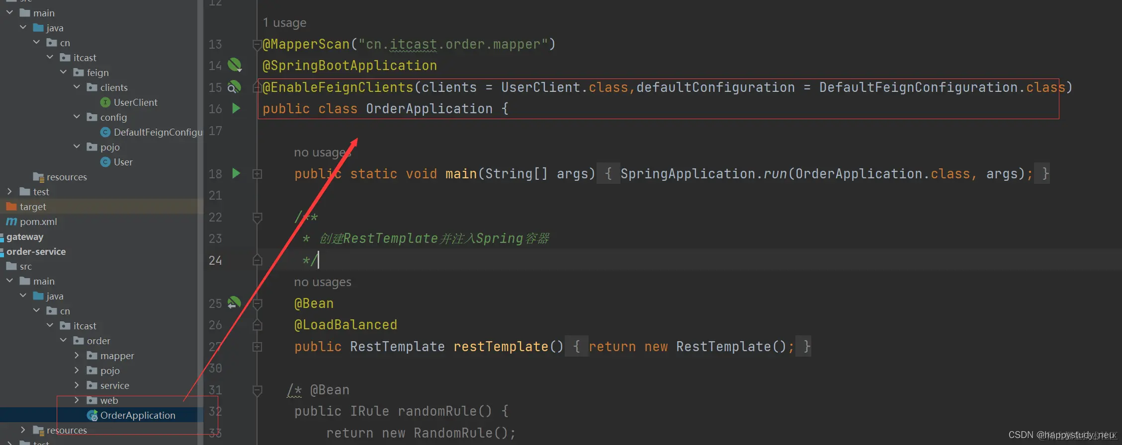 UserClient就相当于这个钥匙@FeignClient就相当于声明它是一个钥匙,而对于想要使用这个钥匙的人,比如order-service: