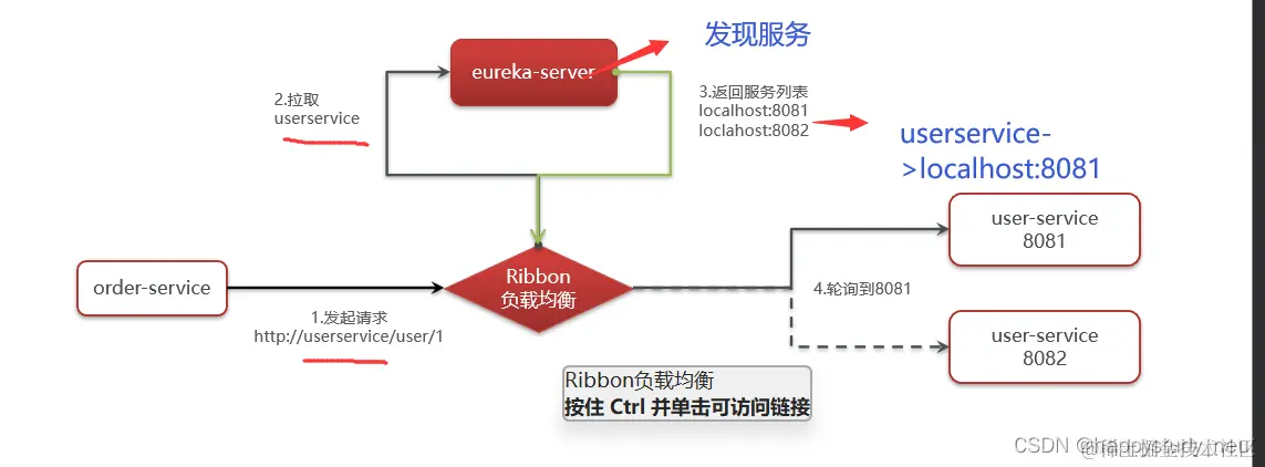 我们在使用的时候还需要通过url来进行详细的拼接, 这里的usrservice是我们的模块名称,也是服务名称,他是注册在服务的注册中心当中,我们通过负载均衡策略去服务中心进行拉取最后决定选择哪一个服务进行调用。类似于userservice->localhost:8080,这是在本地和服务配置实现的。可以使用eureka和nacos服务注册中心。