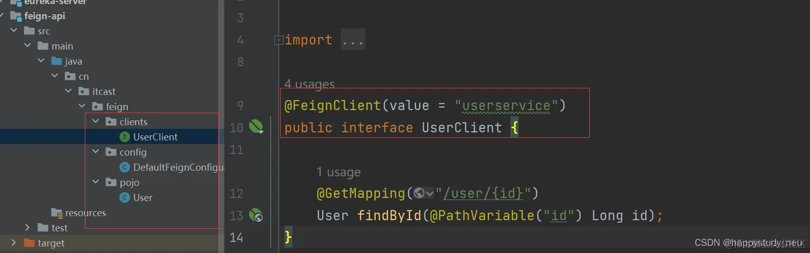 这个作用就是springboot去自动扫描容器内的feignclient,就是你要使用出租屋,你得知道钥匙放在哪里吧(@EnableFeignClients),并且要使用哪一把钥匙(clients = UserClient.class)