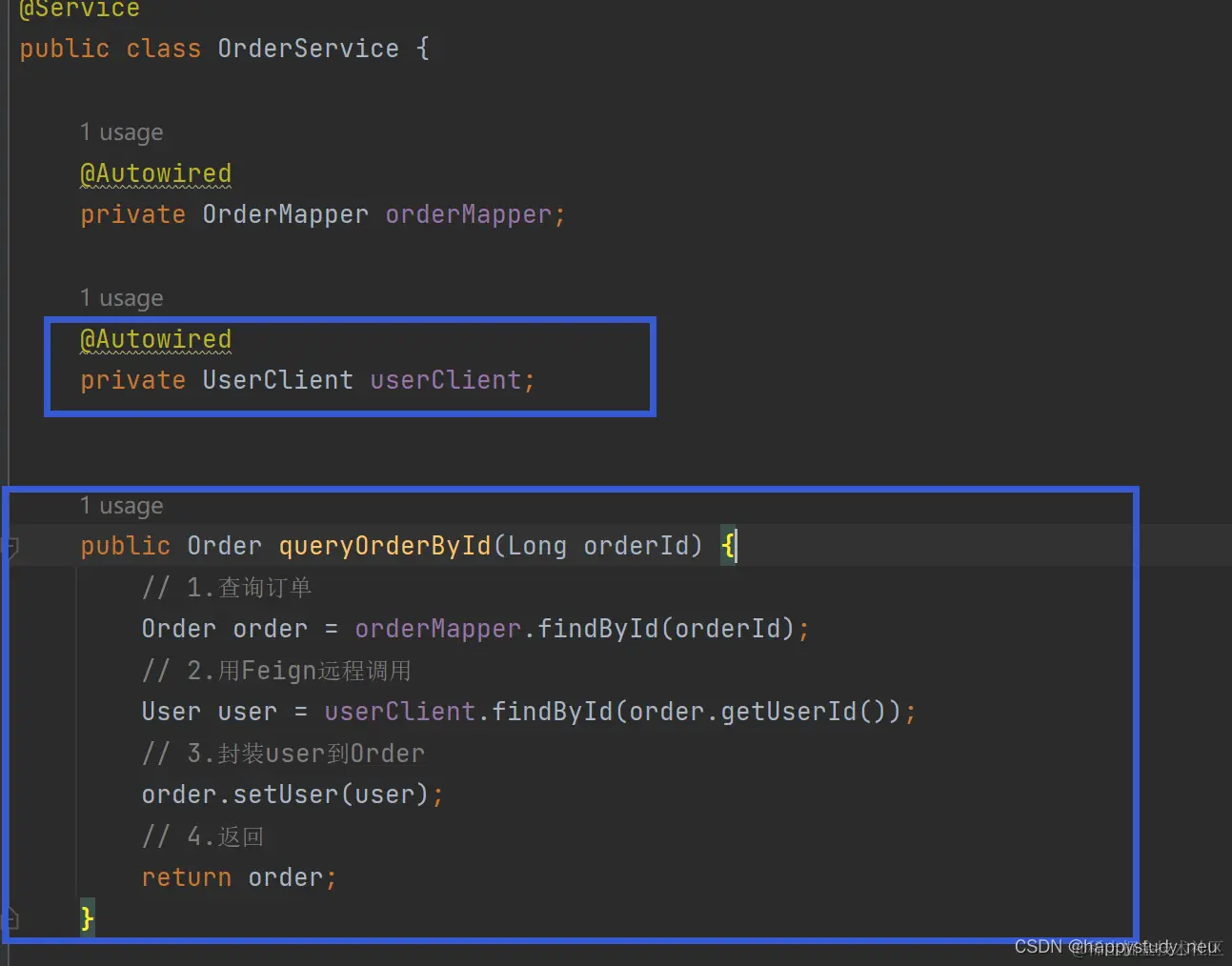 这样服务和启动类配置好之后,springboot启动一扫描就知道,啊,原来我有这些屋子和钥匙可以使用,所以,order在使用user的时候就会变成: