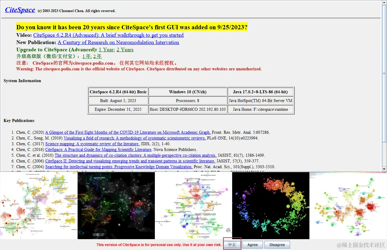 打开CiteSpace软件,可以点击“English”按钮,就会切换成中文,这是更适合中国宝宝体质的CiteSpace模式🤗。然后点击“agree”,进入CiteSpace界面,如下图所示: