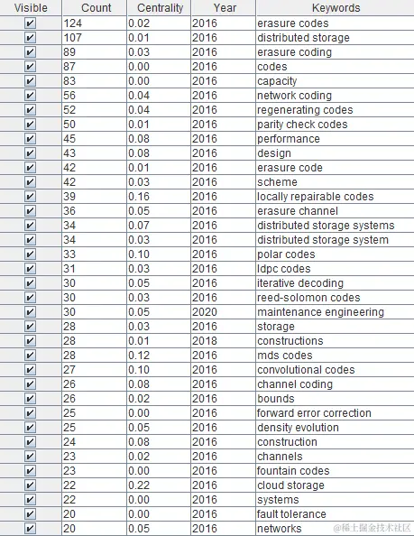 首先对纠删码的这批数据进行关键词分析:通过Citespace中的关键词共现图、高频词分布以及关键词突现来观察研究热点。