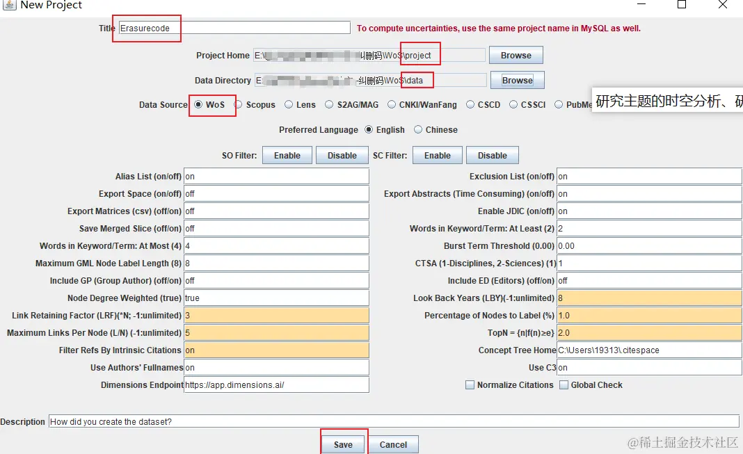 首先,点击“新建”,新建一个项目,取名为:erasurecode,然后设置好“project”和“data”文件夹,然后选择“WoS”,最后保存即可,如下图所示: