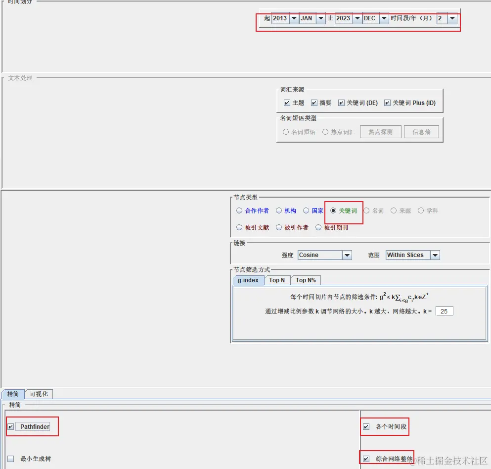 然后就是正式选择分析参数啦,选择想要分析的时间范围,我选择的是2013-2023年这十年的时间,时间片段是每2个月一分析,节点的类型选择的是“关键词”,选择“Pathfinder”、“各个时间段”、“综合网络整体”方式,如下图所示:
