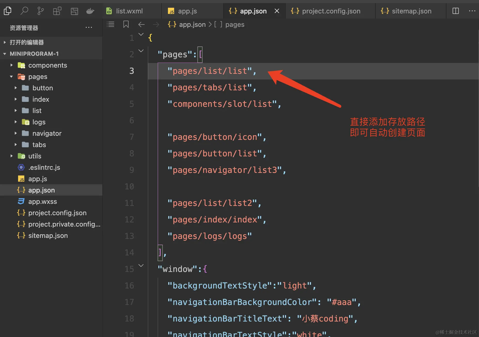 只需要在 app.json -> pages 中新增页面的存放路径,小程序开发者工具即可帮我们自动创建对应的页面文件