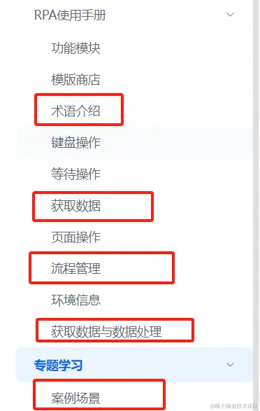 我们依然需要阅读官方的 RPA使用教程 。由于这一部分的内容相对较多,我就框出来要看的部分。相比进阶部分的内容,中级操作选项更需要我们动手。甚至有些操作选项,你要运行模板商店里的某些模板,然后再分析,才能领会其功能与限制。这一阶段的学习,除了“搭建最简单的RPA流程”思路外,我们还要利用模板商店里面的资源(见文末推荐阅读)。