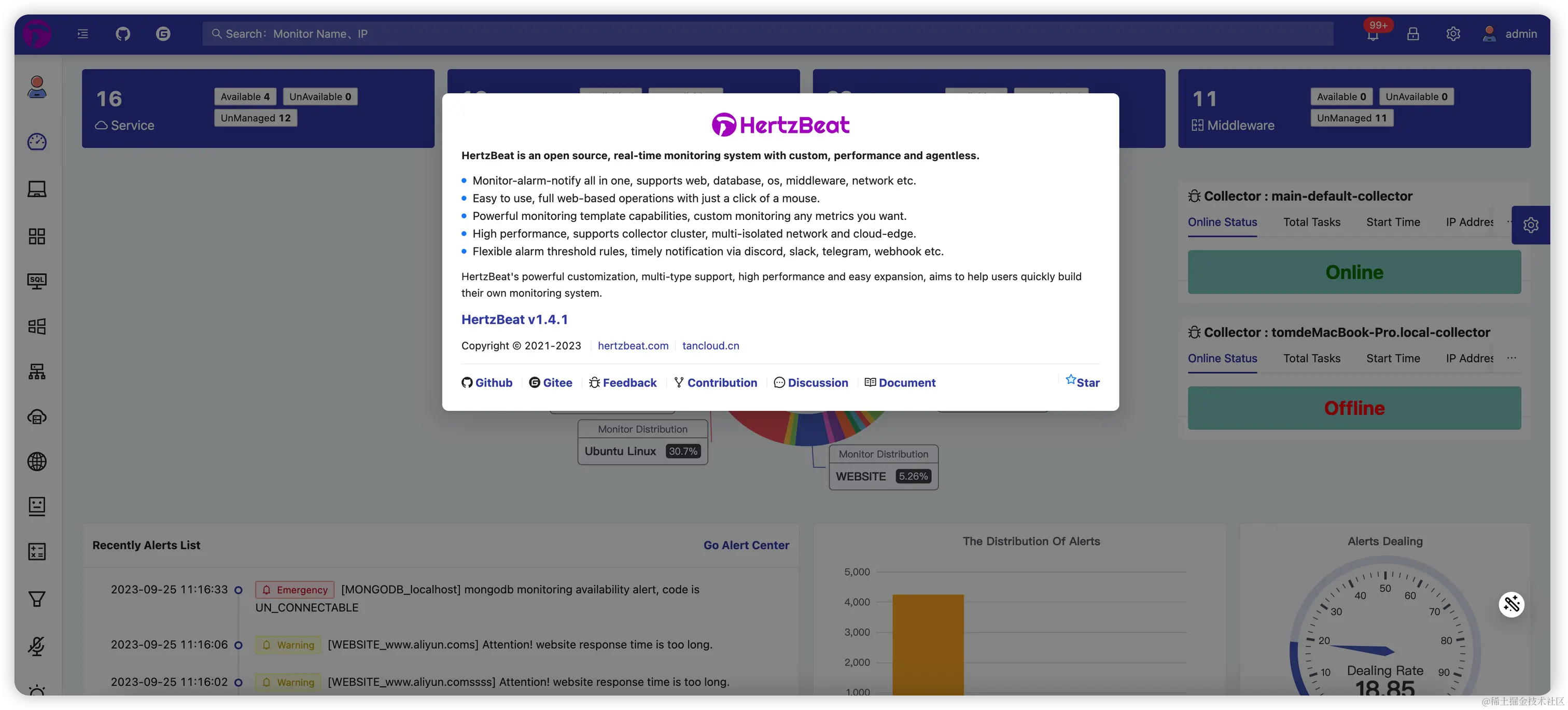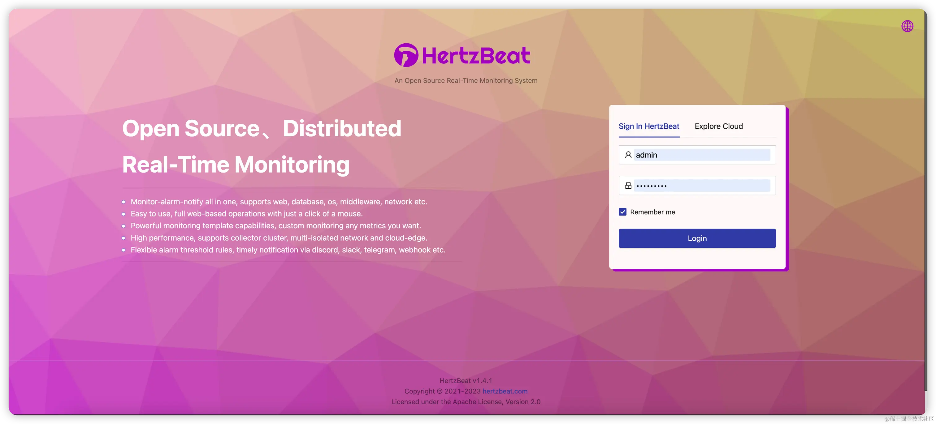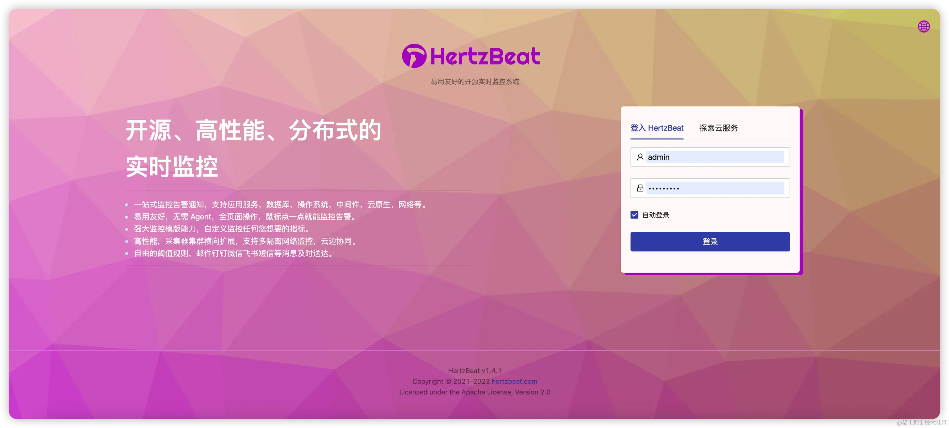 哈喽大家好,时间很快两个月又过去了,HertzBeat 经过近两个月的迭代终于发布了 v1.4.1 版本。为什么是终于,因为有点难哈哈。我们参考 rocketmq 重构了 netty 的 server client 端模块,重构了采集器集群调度。比起上一版本有了更优雅的通讯代码,更完善全面的集群。 采集任务一致性hash调度,集群心跳保活,断开主动重连,主动上线下线,主动停机等等这些都有。设计了新的控制台登陆界面和欢迎页面,支持了采集器集群的UI管理,合并了开源之夏两位同学的帮助提示头特性和阈值表达式特性,很多用户需要的监控指标名称国际化等等,最重要的当然是修复若干BUG,增强了用户体验(自我感觉良好)。