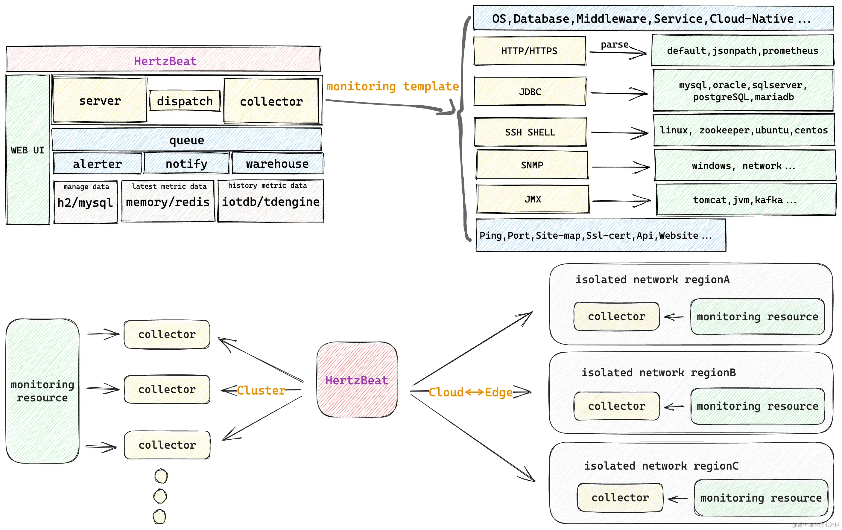Http,Jmx,Ssh,Snmp,Jdbc等协议规范可配置化,只需在浏览器配置监控模版YML就能使用这些协议去自定义采集想要的指标。您相信只需配置下就能立刻适配一款K8s或Docker等新的监控类型吗? - 高性能,支持多采集器集群横向扩展,支持多隔离网络监控,云边协同。