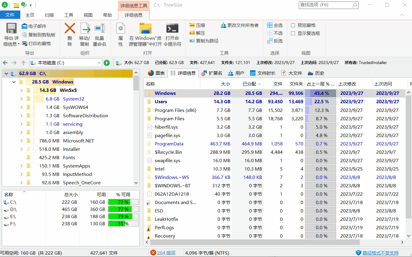 这款软件操作简单,选择需要分析的磁盘开始分析后,左侧列表中很明显的看到磁盘下各个文件夹的大小。