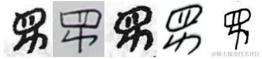 古彝文字体、字形的变化较多,没有统一的手写规范,且不同地区书写规则不同,存在大量的变形字和异体字,例如,如下图所示,表示“种类”的古彝文就有四种不同的写法,并且存在大量字形相似,甚至在视觉上没有太大差别的字,在意义上毫无联系,这为古彝文的识别增加了难度。