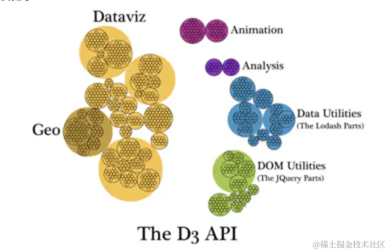 | D3:几乎凭 Mike Bostock 一人之力完成,在学术界、专业团队中享有极大声誉。 该库更接近底层,与 g2、echarts 不同,d3 能直接操作 svg,所以拥有极大的自由度,几乎可以实现任何 2d 的设计需求。 正如其名 Data Driven Documents,其本质是将数据与 DOM 绑定,并将数据映射至 DOM 属性上(这时视觉通道、比例尺转换等理论就可发挥作用)。 同时,如下图,d3 长于可视化,而不止于可视化,还提供了数据处理、数据分析、DOM 操作等诸多功能。 |