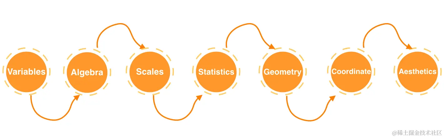 所构建出的图表是由一系列独立的图形语法元素组合而成的,包括数据、图形属性、几何标记、度量、坐标系、可视化组件、分面等。 即:一张图表就是从数据到几何标记对象的图形属性的一个映射,此外图形中还可能包含数据的统计变换,最后绘制在某个特定的坐标系中。 |