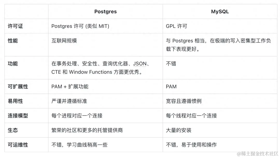 我们对 Postgres 和 MySQL 在以下几个维度进行了比较: