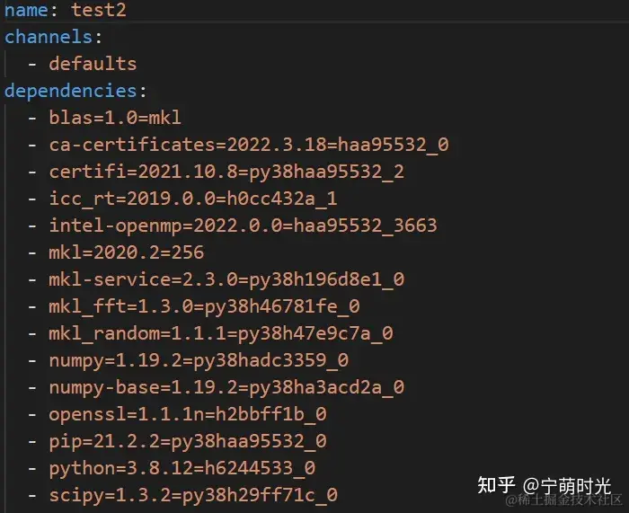 情况二:如果安装时设定了版本号,例如:配置虚拟环境 test2 时设置 package 版本号:conda create -n test2 scipy=1.3.2 ,以及在虚拟环境 test2 中安装 package 时设置版本号: conda install pandas=1.2.3,版本号都会和 package 名一起导出。如下图所示: