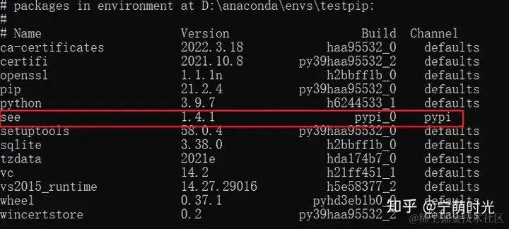 再运行 conda list,结果如下图所示,可以看到安装包 see 是 pip 安装。