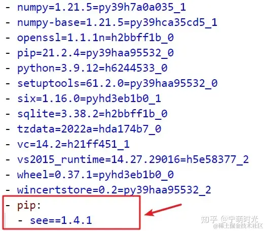 注意:(1)导出的 envname.yml 文件存放在 Anaconda (Powershell) Prompt 当前运行的文件夹中。如果导出的 yml 命名为 environment.yml,而当前目录已经有 environment.yml,此时会重写文件。(2)虽然是 conda 命令,如果使用了 pip 安装 package,这一 package 的设置也会写入。比如,我在一个虚拟环境中先用 conda 安装了 NumPy,然后又用 pip 安装了 see,导出为 yml 文件。发现在 yml 文件 “dependencies”( 也就是 packages 列表)中,有一项是用 pip 安装的 packages ,如下图所示: