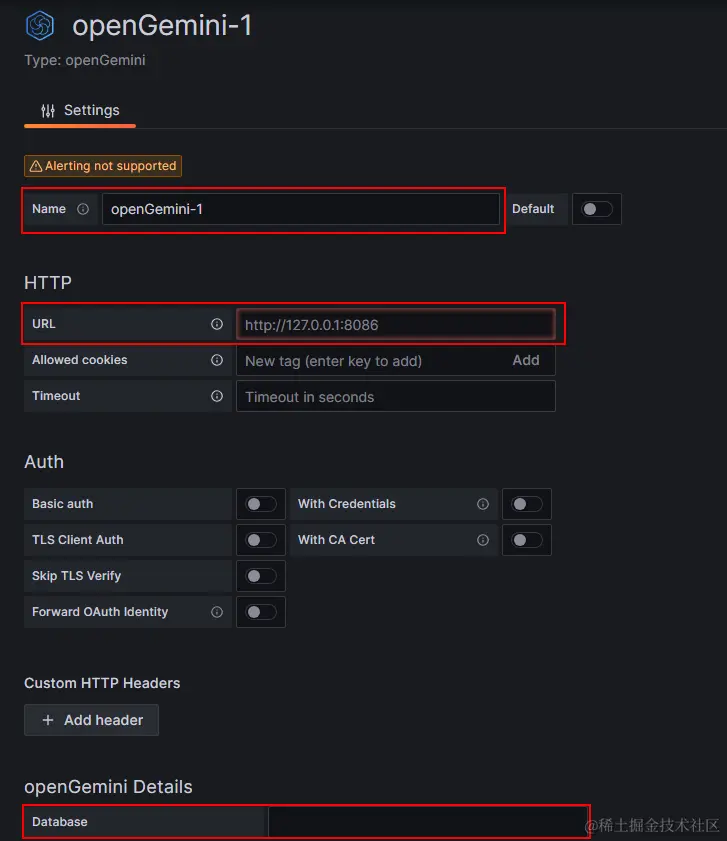 配置链接 openGemini 的各项参数,比如 HTTP URL,用户名密码,数据库等相关信息