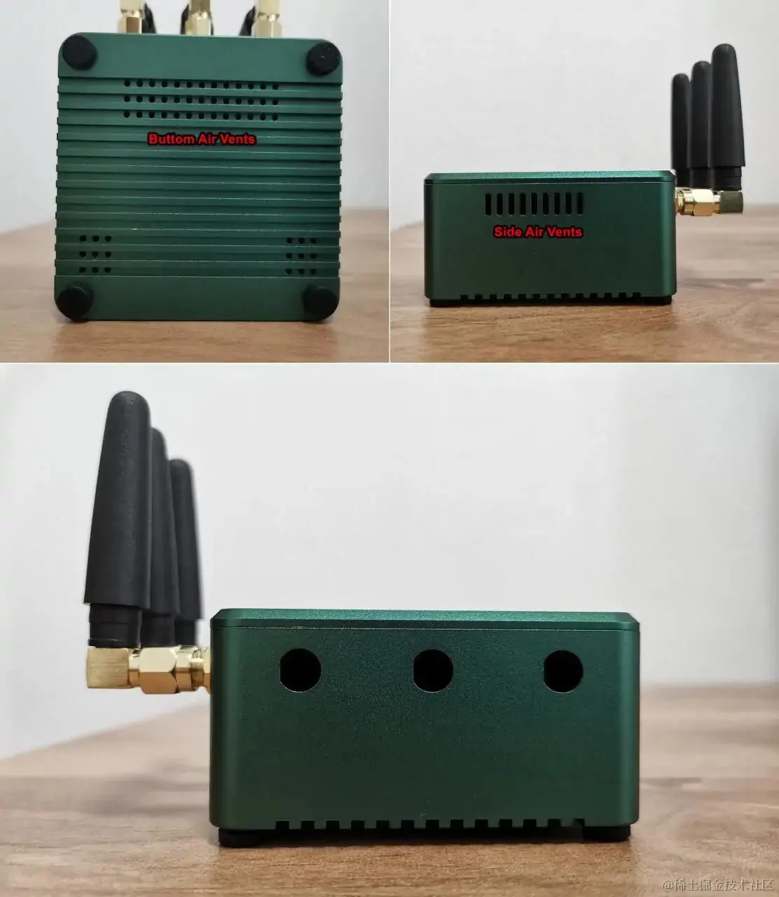 外壳的右侧和底部均设有通风孔。inoVoip 团队添加了额外的天线安装孔,用于安装 4G/5G 模块。