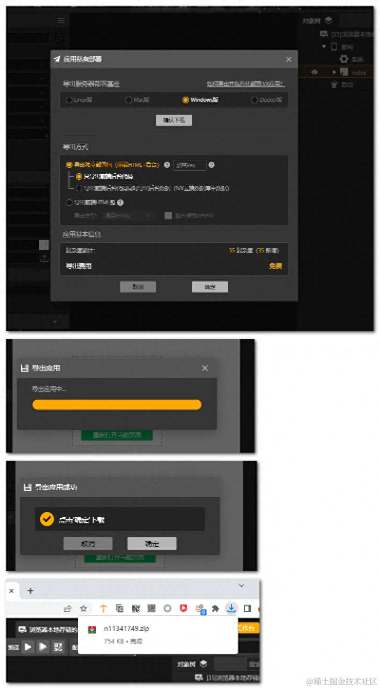 接下来他会弹出一个应用私有部署的窗口,在这个窗口之中,我们点击导出独立部署包,然后选择只导出前端后台代码。然后后面你跟着图片步骤操作,可以看到它下载了一个名为n11341749的zip压缩包,这个压缩包很关键。当然,这还没完,我们还缺一个关键的程序。