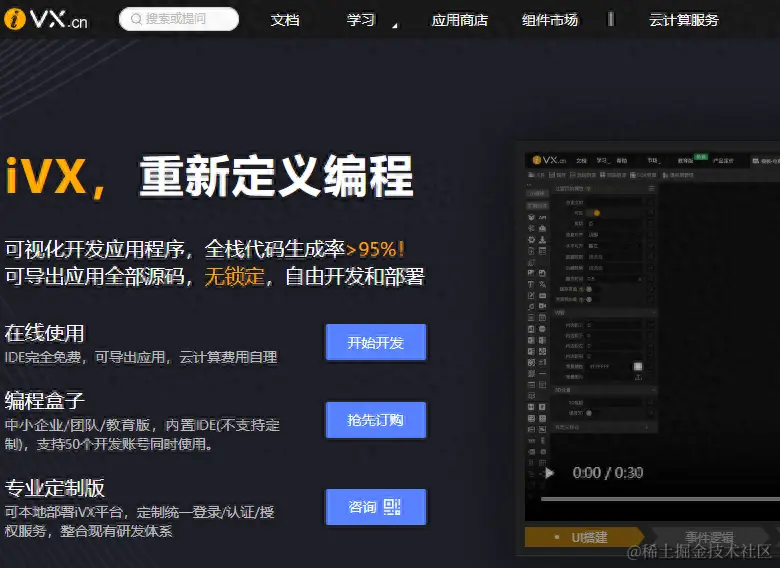 实现的这个过程还是挺挠头的,很多东西都是一样,你得学习。iVX绝对值得你花点时间去学习。我们来看下这个东西是怎么做的,首先我们还是打开iVX的官网,你去点击那个开始开发。