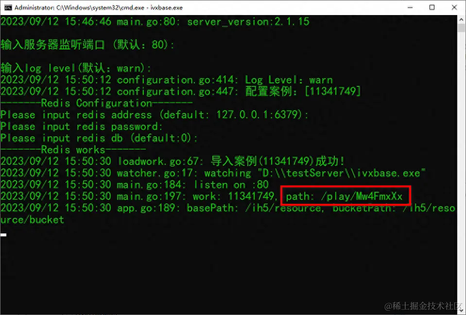 接下来就是比较关键的步骤了,我们通过CMD进入ivxbase.exe所在的目录,然后全部直接回车,前提是你要把redis以及mysql安装上哦。注意冒号后面没写的都是默认的。一路回车这个web程序就算跑起来了。。是的,这样就完事了。最后我们复制一下path路径,就是我红框圈住的部分。