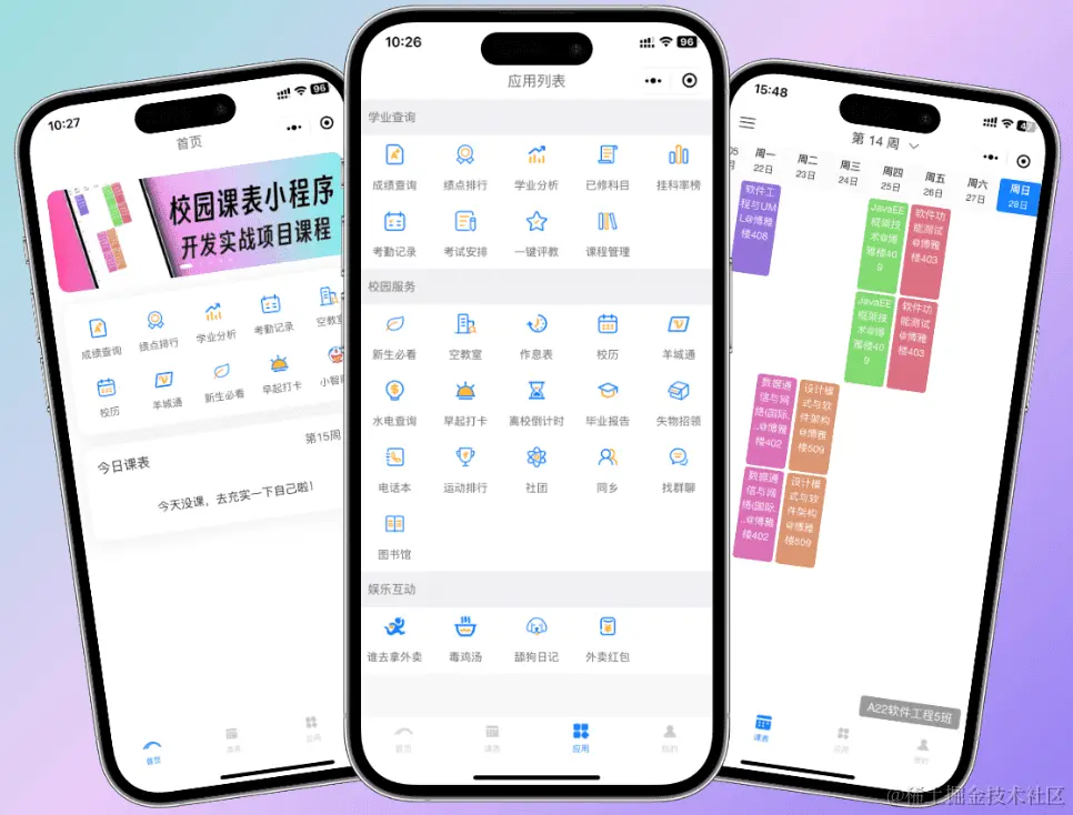 21、yunxiaozhi:一款开源的校园教务查询微信小程序。该项目是由学生开发的智慧校园小程序,支持课程表查询、成绩查询、考试安排、空教室查询、水电查询等功能。
