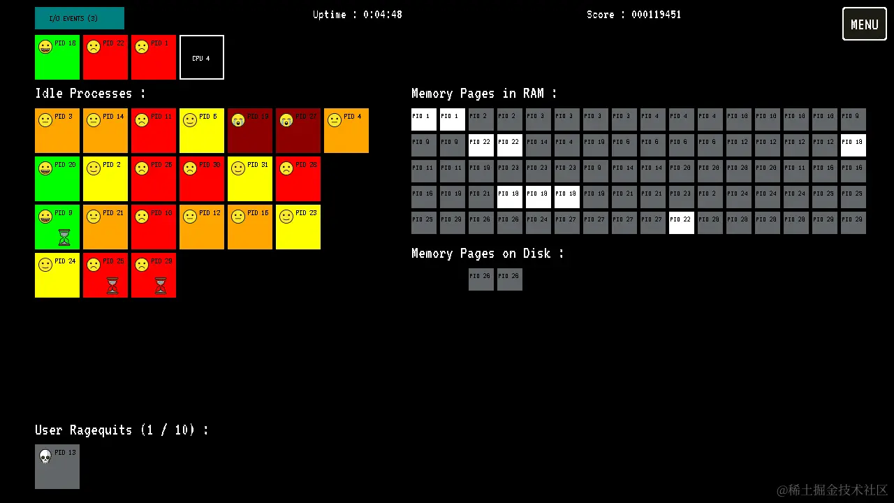 27、youre-the-os:模拟计算机操作系统的游戏。这是一个 Python 写的 Web 游戏,在游戏中玩家扮演的是一台计算机的操作系统。玩家必须通过管理进程、内存和 I/O 事件,不让进程闲置太久,因为进程等待太久就会退出,如果退出的进程达到一定数量后,计算机就会重启则游戏失败。